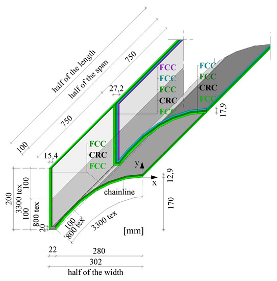 Cross section layups of reinforced shell sections consisting of 3300 tex and 800 tex fabrics, fleece concrete composite (FCC) and carbon reinforced concrete (CRC) displayed for a quarter section of the girder corresponding to the two planes of symmetry [24].
