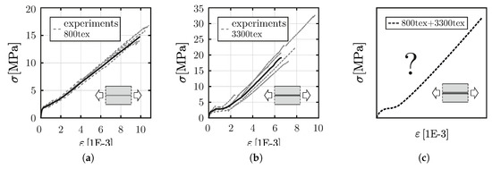 In the girder member described in Section 2, four regions were reinforced with both types of fabrics i.e., 3300 + 800 tex. However, no tensile test that could be used for calibration of such a cross section has been conducted. Thus, to derive the stress–strain curve of such a cross section, a mixture rule must be used to extract the theoretical tensile behavior from the separately tested 3300 tex and 800 text cross sections.