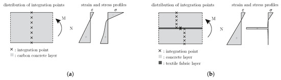 Stress and stress and profiles for the considered representations of the composite cross section with the distributions of integration points over the height: (a) smeared idealization with uniform material in each material point; (b) resolved cross-sectional idealization with different material behavior in plain concrete and fabric layers