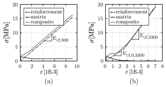 Reinforcement and composite stress–strain curves for cross sections with (a) single 800 tex and (b) 3300 tex reinforcements and the combined cross section.