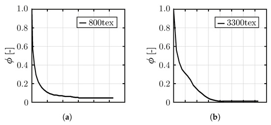 Moreover, another structural effect within the bundle that makes the transformation of material characteristics non-trivial can be recognized in Figure 11b. Fabrics with a large yarn cross-sectional area containing up to 50,000 filaments can exhibit a phenomenon called slack, meaning that the reinforcement reaches its full stiffness only after some initial level of loading. This effect occurs when a non-negligible amount of filaments is not aligned with the direction of loading so that they must be stretched before they can start to contribute to the load transfer.