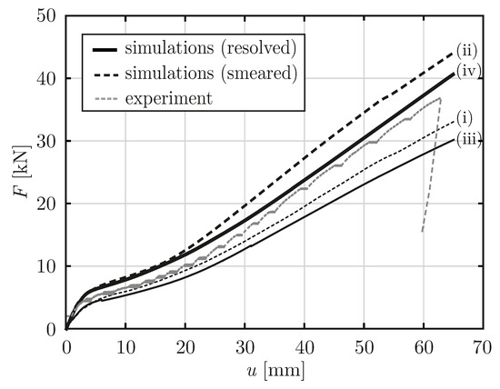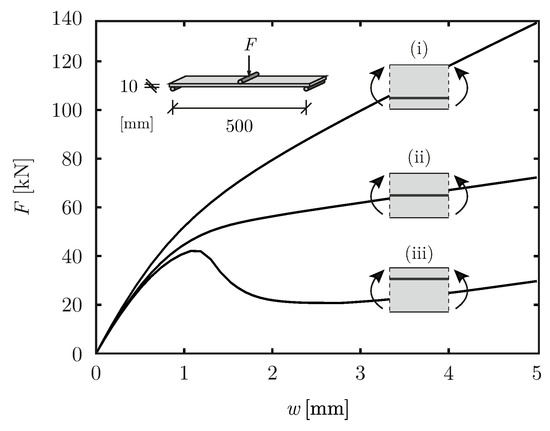 As mentioned in Section 3.3, a correct prediction of the bending response is one of the requirements that leads to the usage of resolved, layered representation of the shell cross section. To test the ability of the resolved model to correctly represent the development of an effective lever arm within a cross section, a parametric study of a three-point bending test with the span of 500 mm and width of 100 mm was performed with three different positions of the fabric within the cross sections. A discrete load was applied at the mid-span of the beam. The cross section with the height of was reinforced with one layer of carbon fabric with 3300 tex. The behavior of the fabrics was assumed isotropic within the reinforcement layer with the stress–strain curve and a layer thickness adjusted such that it matches the area of the fabric within the cross section. The studied configurations (i), (ii) and (iii) are shown in Figure 14 together with the corresponding load–deflection curves obtained from the simulation. The deflection was recorded using the midspan section of the girder.