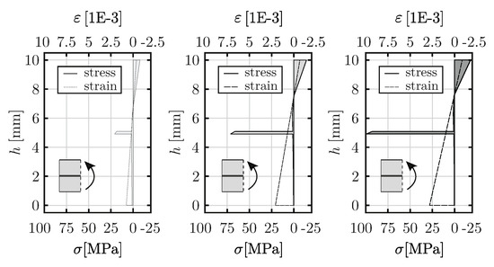 As apparent from the figure, the effect of the placement of the fabric is reproduced plausibly. The placement of the fabric at the bottom of the cross section in the tensile zone leads to a large lever arm and, thus, to an activation of a higher amount of compressive stresses within the cross section. As a result, this study shows the structural response with high stiffness and ductility (iii). The qualitative effect of reduced lever arm for configurations (i) and (ii) is reproduced correctly. For illustration, the development of the stress over the cross-sectional thickness for three selected levels of load is shown in Figure 15.