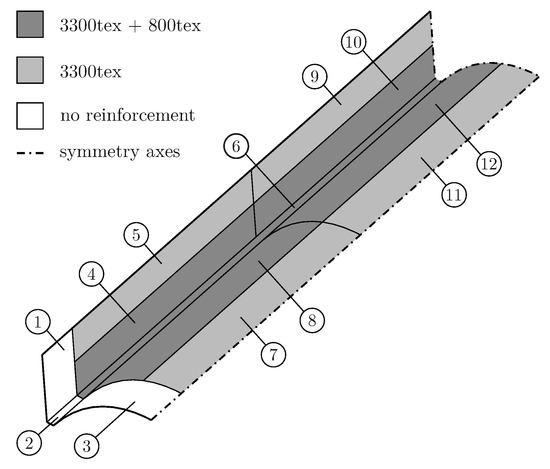 Finite element model of the tested girder described in Section 1 has been decomposed into twelve zones to account for the different cross-sectional layups as shown in Figure 16. Sections 4–12 correspond to the reinforced sections displayed previously in the technical drawing in Figure 4. In addition to the reinforced sections, the finite element model also includes the non-reinforced boundary sections 1–3 positioned behind the supports.