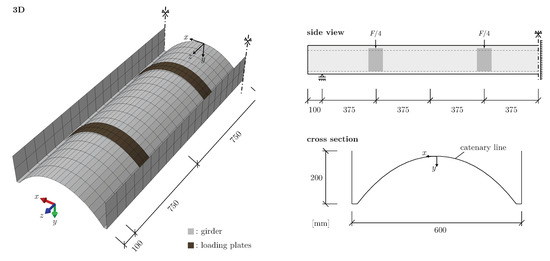 The girders were tested using a six-point bending test depicted in Figure 5. The load was introduced using wooden plates following the catenary curve of the vault within a girder section. The experimentally obtained load–deflection curves obtained in the test are used later on in Section 4 for the validation of the discussed modeling approaches.