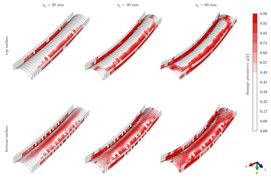with denoting the lowest microplane integrity level at a material point. The propagation of the damage through the shell is depicted in Figure 22 separately for the top and the bottom surfaces at three levels of loading corresponding to deflections , and .