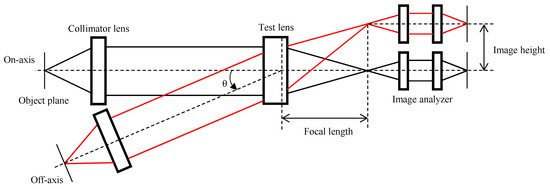 As shown in Figure 1, the measurement system is composed of a collimator, which converts light from a light source into a collimated beam, a test lens to be measured, and an image analyzer, which magnifies the image formed by the test lens [10]. In other words, light starts as a pattern from an object plane illuminated by a light source and is converted into a collimated beam by the collimator lens. The collimated beam then passes through the test lens to form an image and, finally, an image analyzer magnifies the image to ascertain the exact image position. Here, if the sizes of the object plane pattern and the image formed by the test lens are known, we can determine the image magnification of the system equipped with a collimator and the test lens. In addition, if the EFL of the collimator is correctly known, we can find the EFL of the test lens [11].