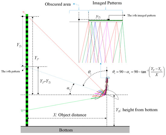 Figure 2 shows the layout for the method used in this study; the illustration in the upper right of Figure 2 depicts the optical layout of the system to be measured in this study. The pattern in Figure 2 is designed to be equally spaced. YT, YB, Yp, and X refer to the overall height of the pattern, the height from the floor surface to the reference plane, the height from the reference plane to the top of the pattern, and the distance between the optical axis and the pattern, respectively. Here, the reference plane is perpendicular to the FOV, which includes the chief ray. A ray reflected from the pattern is captured on the image sensor by the omni-directional system. We can obtain the image height for each position of the pattern as well as the angle θ incident on the optical system from the configuration in Figure 2. The angle of the ray, θ, can be evaluated using the position of each pattern and the distance between the pattern and the optical system.