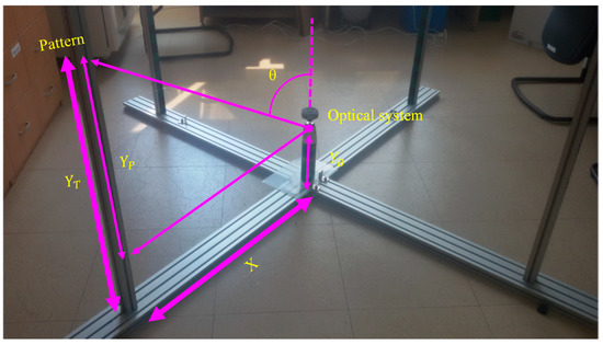 The second source of error is the inaccurate recognition of pixels. The reference for determining the cutoff point of a pattern in Figure 6 is the sudden change of the color component in a pixel. The “G” (green) color component is the only one needed because the pattern used in this study has green patterns on a black background. The accuracy of pattern recognition may be enhanced by providing clear contrast in the pattern shape. The third source of error is the tilt error between the measurable optical system and the pattern. In this case, the interval error of the pattern would cause an error in YT. As a solution to this error, a mean value of four patterns was used, and this proved the feasibility of the measured system.