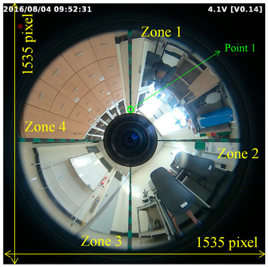 Figure 4 shows the pattern images taken with the system. The patterns were installed 90° apart, as shown in Figure 3, and there are four patterns in the image, as shown in Figure 4. The omni-directional system is generally designed to have the maximum FOV at the shorter side of the image sensor. Thus, the image obtained at the image sensor has the same number of vertical and horizontal pixels, as shown in Figure 4. The calculation of the number of pixels in the pattern helps determine YT using Equation (1). The incident angle, θ, for the pattern can also be easily determined owing to the uniformity of the pattern. For an accurate calculation of YT, however, we need to identify the screen center. The center of the image sensor and that of the optical system may not coincide due to assembly error within the system and the image sensor. Figure 5, an enlarged image of the central obscuration in Figure 4, shows a photograph of the screen center obtained from an extension line of the pattern shown in Figure 4. The center of the screen obtained using this method would be at 744 pixels crosswise and 807 pixels lengthwise from the upper left of the screen.