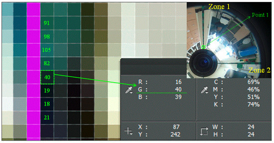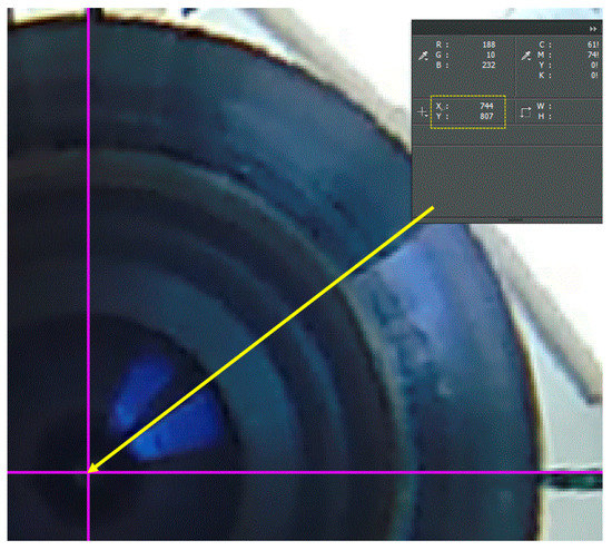 Figure 6 shows an enlarged image of Point 1 in Figure 4. We used Adobe Photoshop (Adobe Photoshop 2016, Adobe Systems, San Jose, CA, USA) to determine the pattern’s cutoff point. The pattern has alternating black and green rectangles of the same size; hence, we can calculate the pattern height at the edge point where the “G” (green) value of the pixel information changes rapidly, as shown in Figure 6. The pattern height here would be in Equation (1).