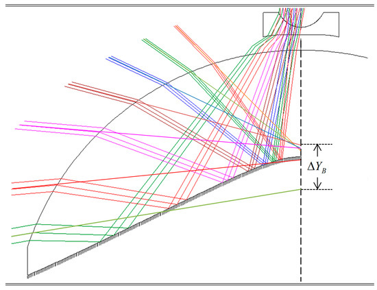 For practical uses of this study, the accuracy of the measurements must be verified. Here, we discuss the possible sources of error during the EFL measurement and methods to improve this measurement. Figure 8 shows the magnified optical paths of the optical system near the first and second lenses. The height from the floor surface to the reference plane changes with changes in the incident angle of the optical system, as shown in Figure 8. This is the first source of error. Because the calculations performed with the measurements, tabulated in Table S3, used the same YB on the assumption that the reference point is the same in all cases, there was error in the height from the reference plane to the pattern, Yp, which caused error in the measured angles. In order to use YB in this calculation instead of the approximation, rays would need to be traced using the system simulation and the height would need to be calculated for each pattern. Since the angle of the pattern and the distance away from the center are set to the same value in the simulation, it would be very difficult to calculate the height corresponding to every ray. Another method for using an approximation of YB, but with less error compared to the previous method, would be to increase X, the distance between the optical system and the pattern. If X is greater than that used in the previous measurement, YT also increases when the same field angle is measured. Because the pattern height, Yp, is the difference between YT and YB, the effect of YB on the calculation error of Yp decreases as YT increases, thus reducing the error in the angle calculation.
