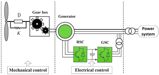 Wind power generation is the most developed renewable energy technology. Wind power has attracted considerable interest worldwide because it is clean and pollution free [1]. The most widely-used wind turbine technology is the doubly-fed induction generator (DFIG) [2]. The volatility and unpredictability of wind power and the high penetration of wind power to the power grid are among the factors contributing to low-frequency oscillation (LFO) in power systems. However, DFIG can be controlled flexibly and can affect system damping by disrupting the power flow or the coupling between generators and power systems to suppress LFO [3]. In some countries, guidelines on wind power grid stipulate that wind turbines should provide (or reserve) damping control functions are based on basic control. Therefore, improving the control strategy of the wind turbine and increasing its ability to suppress the power oscillation of a system are of great significance to the safe and stable operation of grids with high wind power penetration.