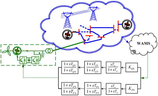 In recent years, DFIGs with additional damping controllers have been extensively researched. In [5], a traditional PSS in the synchronous machine in the control loop of the DFIG was used to suppress the low frequency oscillation of a power system. Initially, the input signal of the additional damping control of the DFIG is local. A wide-area measurement system (WAMS) enabled by the dispersed deployment of phasor measurement units (PMUs) can capture the dynamic information of a power system—i.e., voltage, current, angle, and frequency—at a high resolution and in near real-time. Owing to the development and advancement of the measurement system, a wide-area signal can be selected into the additional control and thus the damping characteristics of the DFIG can be further improved. It can be divided into active modulation and reactive modulation according to the type of DFIG output signal. In [5,6,7], an additional damping controller within the active power is proposed. The APM method can improve system damping by adjusting the rotor-side converter variable reference value. However, the damping of a DFIG-wind turbine shaft mode evidently decreases when APM is applied [8] and reduces the life and reliability of a drive shaft system. Given that DFIG can control active and reactive power independently, RPM through an additional control attached to the reactive power control circuit can damp power system oscillations [8,9,10]. This method does not increase the torque oscillation amplitude of a wind turbine drivetrain shaft. However, the effectiveness of RPM in suppressing inter-area oscillation depends on the reactive power injection position and voltage characteristics of the load. Therefore, in some cases, relying on RPM may not achieve the desired system damping [11].