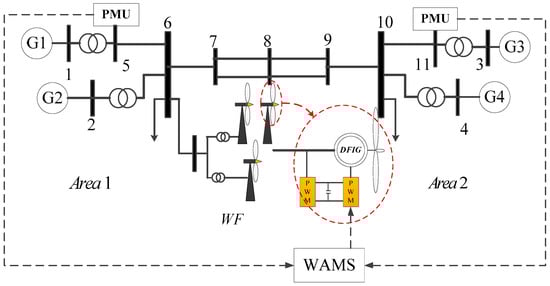 The system diagram presented in Figure 5 is implemented in the simulation. The 2-area 4-machine system with wind farm is used to verify the control effect of the damping controller designed. Area 1 and area 2 have two synchronous generators each, and each generator produces 835 MW rated power. The transmission power between the two areas is 408 MW. Only generator 4 is equipped with a PSS to increase the damping of its local oscillation. The parameters of the synchronous generators are shown in Table A1 of Appendix A. Wind farm based on DFIG is connected to the grid in area one and represented by one aggregated DFIG. The rated exporting level of the wind farm is 200 MW. The DFIGs operate in the maximum-power tracking active-control mode, and the reactive power adopts the unit power factor control mode. The specific parameters of the DFIG are shown in Table A2 of Appendix B.