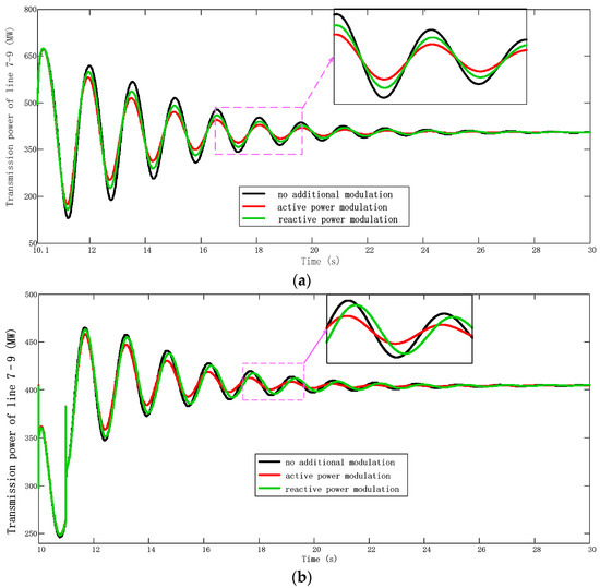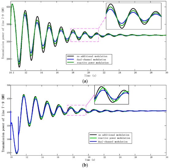 (a) Transmission power of Line 7–9 at Case A; (b) Transmission power of Line 7–9 at Case B.