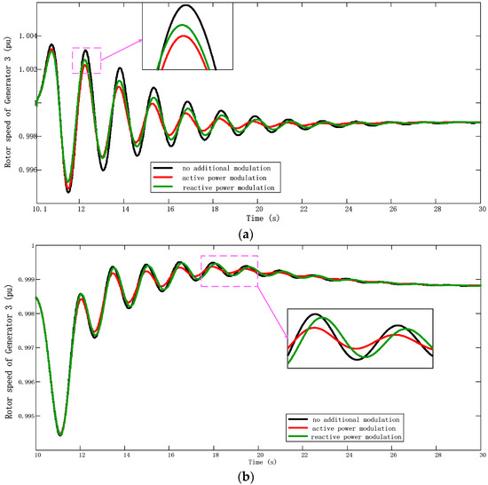 Figure 6 shows a dynamic response diagram of the transmission power of the Line 7–9 under APM and RPM. As shown in Figure 6, without an additional damping controller, the amplitude of power oscillation of the transmission line is larger than that with an additional controller. Figure 7 shows a dynamic response diagram of the rotor speed of Generator 3 under APM and RPM. Through simulation comparison, it is found that the damping capacity provided by APM is stronger than that of RPM. Oscillation attenuation speed is faster and the transient oscillation amplitude is smaller under the active modulation. The active power modulation has good control performance when the power system appears inter-area oscillations, thereby verifying the control effect.