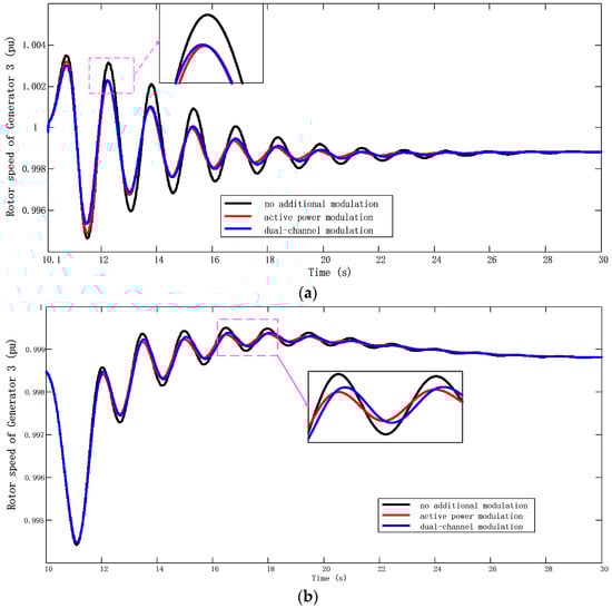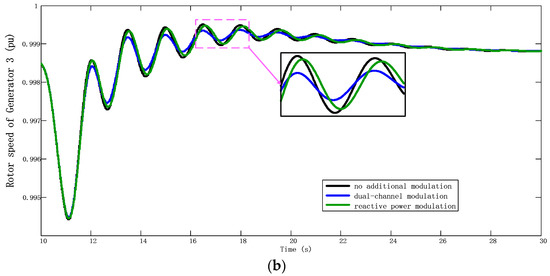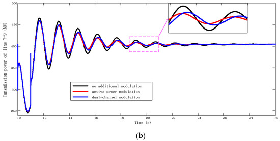 Figure 8 and Figure 9 show a dynamic response diagram of the transmission power of Line 7–9 and the rotor speed of Generator 3 under APM and DCPM. It can be seen that the damping capacity provided by the dual-channel power modulation is nearly the same as the active modulation; the oscillation attenuation speed is fast, and the transient oscillation amplitude is small.