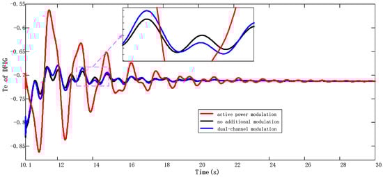 The above comparison shows that the active power additional damping control has a better suppression effect on inter-area oscillation of a system. As the additional active damping controller increases the damping signal gain, the suppression effect is pronounced. As the gain of the damping signal increases, the unbalanced torque excites the torsional oscillation mode of the shafting, and the amplitude of the torsional oscillation of the wind turbine increases. The amplitude of the inherent torsional oscillation frequency of the DFIG’s shaft system is increased to an extent.
