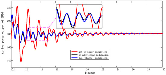 Figure 12 shows the dynamic response of the shaft torque of the DFIG. An inherent wind turbine shaft oscillation mode exists in the DFIG. Evidently, the active power modulation exacerbates the amplitude of the oscillations. Figure 13 shows the dynamic response of the electromagnetic torque of the DFIG. As shown in Figure 13, the fluctuation of the torsional oscillation affects the electromagnetic torque fluctuation through the shafting, which in turn causes the fluctuation of the active output amplitude of the DFIG to increase. The active power output of DFIG is plotted in Figure 14. When the output power of the doubly-fed wind turbine is injected into the power grid, an oscillation component of about 1.82 Hz appears in the output power of the wind farm because of the unstable shaft speed oscillation. As the penetration rate of wind energy continues to increase, the fluctuation of the active output of the wind turbine adversely interacts with the power system and threatens the stability of the power system.
