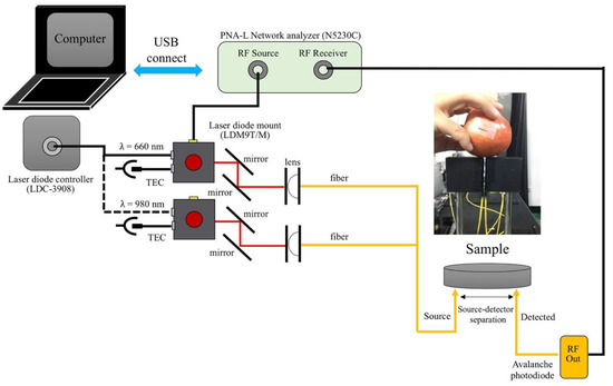Figure 1. Schematic of the frequency-domain diffuse reflectance spectroscopy (DRS) system configuration.