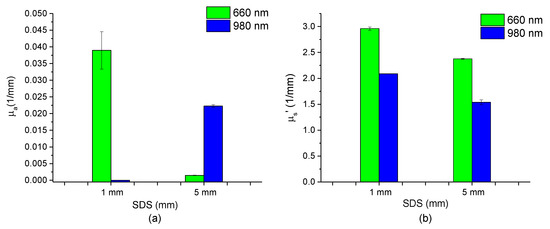 Figure 3. (a) Absorption and (b) reduced scattering coefficients of an apple recovered at 660 nm wavelength (green bar) and 980 nm (blue bar) at source–detector separation (SDS) of 1 mm and 5 mm.