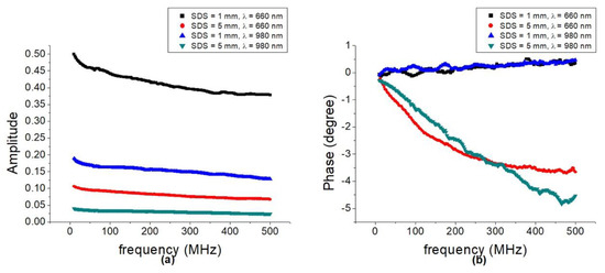 Figure 4. (a) Amplitude and (b) phase of apples verse the source modulation frequencies generated from different source–detector separations (SDSs) and wavelengths: 1 mm at 660 nm (■), 5 mm at 660 nm (●), 1 mm at 980 nm (), and 5 mm at 980 nm ().