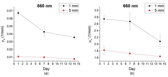 Figure 5. (a) Absorption and (b) reduced scattering coefficients of an apple recovered at source–detection separation (SDS) of 1 mm (black squares) and 5 mm (red circles) 1, 7, and 14 days after purchase at a wavelength of 660 nm.