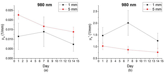 Figure 6. (a) Absorption and (b) reduced scattering coefficients of an apple recovered at a wavelength of 980 nm at source–detection separation (SDS) of 1 mm (black squares) and 5 mm (red circles) 1, 7, and 14 days after purchase.