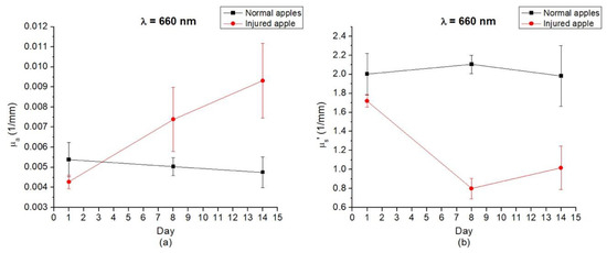 Figure 7. (a) Absorption and (b) reduced scattering coefficients of injured apples (red circles) and normal apples (black squares) recovered at a wavelength of 660 nm in 14 days.