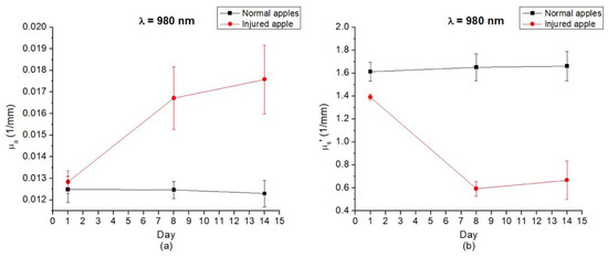 Figure 8a shows that the μ a of normal apples at 980 nm decreased slightly, but that of the injured apple increased rapidly. We suspect that the vacuolation and cytoplasmic collapse of the damaged cells caused the cell wall degradation, and caused the cytoplasm to spread out, thereby causing the increase in the μ a of the injured apple at 980 nm. Figure 7b and Figure 8b show that the μ s of the normal apples were almost invariant; however, they were significantly decreased in the injured apple in the first 7 days. We suspect that the vacuolation and cytoplasmic collapse of the damaged cells caused the μ s to decrease rapidly at 660 and 980 nm. From day 7 to day 14, the μ s of the injured apple increased. It is assumed that the extensive freezing damages caused by the change in cell structure led to the increase in the μ s [28].