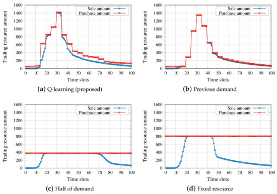 Figure 4 shows the purchase and sale amounts obtained by each of the strategies. The same simulation parameters were used in all four simulations as mentioned above, where the flow ratio was chosen randomly. In the static resource allocations, available resources are distributed among tenants based on a predefined algorithm regardless of current states of slices. Note that we set the fixed purchase amount of