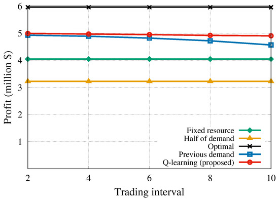 previous-slot-demand algorithm demonstrated a slightly decreasing profit because it did not consider future information, whereas the proposed algorithm was scarcely affected by the changes in the trading interval and earned the highest profit compared to the other algorithms.