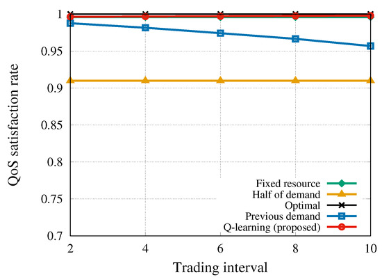 Figure 6 demonstrates that the proposed algorithm kept a very high QoS satisfaction rate because it allowed purchasing the required bandwidth in advance. This is the result of taking optimal actions according to the states for every
