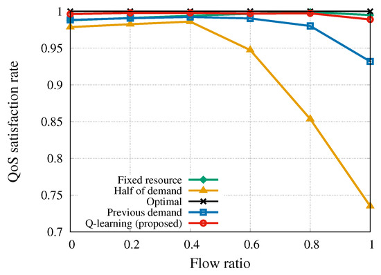 To study the impact of the flow ratio on the algorithm performance, we plotted the QoS satisfaction rate of each algorithm according to the flow ratio