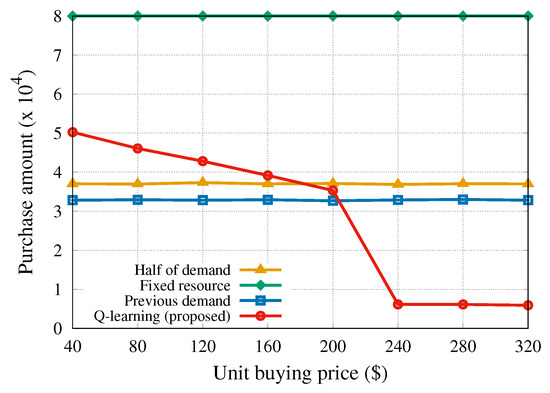 $200 would lead to a serious profit loss. Considering this fact, we can observe that our algorithm minimized the damage by reducing the amount of purchased resource when the unit buying price exceeded