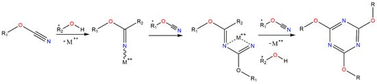 CE monomers polymerize via a ring-forming reaction under the conditions of heating or catalysts. Simmon first proposed the self-polymerization mechanism of CE resins in the absence of a catalyst [12]. The curing reaction of the CE resins was initiated and catalyzed by impurities in the monomer or moisture in the environment. However, this process proceeds with difficulty when the purity of the monomer is high [13]. Active hydrogen containing compounds, such as phenols, amines, and imidazole, in concert with metal ions can catalyze the curing of CE resins [14]. This reaction is depicted in Figure 1. A range of such metal ions has been reported, including chromium [15], manganese [16], iron [17], cobalt [18], tin [19], zinc [20], and copper [21]. However, the metal ion compounds have poor solubility in the CE resins and promote the hydrolysis reaction of the triazine ring as well; as a result, these metal salts are rarely used as a catalyst. Alternative catalytic systems have always been an important direction of research. At present, room temperature ionic liquids (RTILs) and organically modified layered silicate have been proved to accelerate CE resin curing [22,23,24].