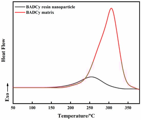 The FT-IR spectra curves of the BADCy monomer and BADCy resin nanoparticles are shown in Figure 3, from which the molecular structure characteristics of the BADCy monomer and BADCy resin nanoparticle were ascertained. Compared with the BADCy monomer, the most apparent differences are the new peaks at 1568 and 1369 cm−1. These two new peaks are due to the triazine ring structure formed by the monomer under the conditions of catalysts and heating [33]. Besides this, the -OCN functional group of the BADCy resin nanoparticles at 2270 cm−1 is reduced compared with the monomer because the chemistry mechanism of the reaction is a trimerization of three -OCN groups into a triazine ring. According to the result of the FT-IR spectra, the -OCN functional group peak at 2270 cm−1 does not completely disappear. It can be seen that the prepared BADCy resin nanoparticles still have an active -OCN functional group and can continue to react. Figure 4 shows a dynamic DSC curve of the BADCy resin nanoparticles and the matrix, indicating that the nanoparticles are still exotherms during the dynamic heating process, but with less heat than the matrix. It can also be concluded that the prepared BADCy resin nanoparticles have reactivity.