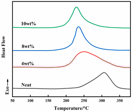 Representative DSC curves are shown in Figure 8, in which (a), (b), (c), and (d) represent the neat, 4, 8, and 10 wt% system, respectively. It can be seen that the curing temperature is proportional to the rate of temperature increase for the same system. Also, the onset curing temperature decreases as the BADCy resin nanoparticle content increases.