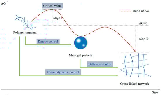 The formation of microgel particles can occur from a thermodynamic point of view. Analogous to the thermodynamic equations of the crystallization process, the thermodynamic equations of the microgel particles can be expressed as: