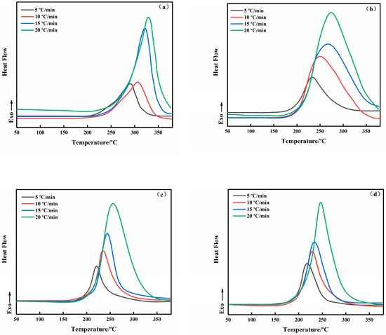 Dynamic DSC curves at different heating rates of neat (a), 4 (b), 8 (c), and 10 wt% (d).