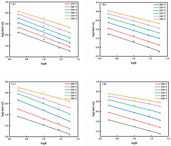 Equation (9) shows that the curing kinetic parameters, k′ and n, can be determined according to the degrees of curing at different heating rates. At a given temperature, a plot of log[−ln(1−α)] on logR should be a straight line with a slope of −n and an intercept of logk′.