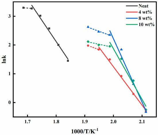Kinetic parameters obtained from Equation (9) at different temperatures under dynamic conditions for the 4, 8, and 10 wt% systems.