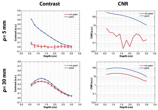 The improvements given by the use of a fast-gated acquisition was less evident if a larger SDD was used, as it was clearly noticeable from curves reported in the last row of Figure 2. Indeed, the contrast obtained exploiting the fast-gating technique was slightly higher than what was achievable in the “non-gated” situation. The CNR graph clearly shows that in the gated mode there was a constant improvement of about a factor of 4.