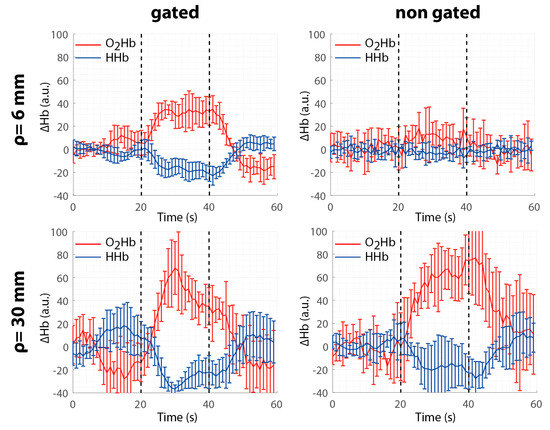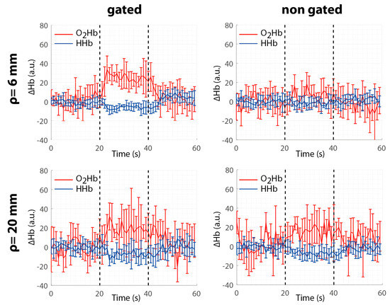 Different works based on FG-SPADs have been published, demonstrating experimentally that an improved spatial resolution, contrast and even chromophore quantification can be achieved using a gated detector [15,16,17]. However, to the best of our knowledge, the FG-SPAD detectors have never been adopted to demonstrate the improvement given by the use of short-SDD in fNIRS measurements. Indeed, the higher spatial resolution allows for the ability to retrieve more precisely the area wherein the activation occurs and the capability to collect photons in a given portion of the DTOF, improving the robustness of the detectability of a brain activation.