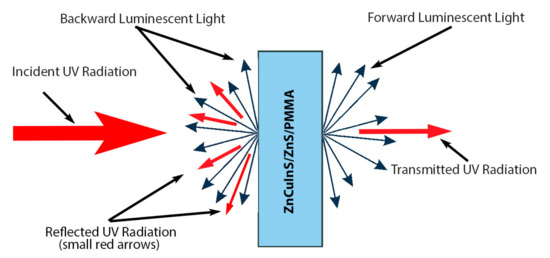 In this research, we present a simple method for the fabrication of QDs/PMMA films. Each step of the manufacturing procedure is described in detail. Forward and backward luminescent light showed a linear increase with the increase of the incident UV radiation. Forward luminescence light, as well as backward luminescent light, saturated when the concentration reached QD150. Both phenomena are explained with well-known mechanisms, such as self-absorption and FRET. It is worth noting that for the ZnCuInS/ZnS QDs the concentration of QD100 might be a marginal concentration, after which the dominant luminescence is reversed from forward to backward, even though more measurements around the concentration of QD100 could optimize the accuracy of that value. The latter is an essential parameter for the design of novel dual-mode imaging modalities such as hybrid UV–X-ray equipment or for in vivo imaging, as well as in microscopy [48,49,50]. This conclusion might also be of value for the design of non-medical applications such as light-emitting diodes (LEDs), displays, and photovoltaics.