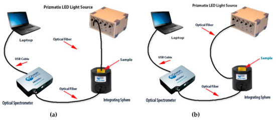 Two experimental configurations were designed for the UV irradiation of the prepared films. Both involved the use of a UV source emitting at 365 nm (Prizmatix multichannel LED light source) and the forward and backward luminescent light was accurately measured by an integrating sphere (Ocean Optics Inc., Micropack Integrating Sphere 50 mm ISP-50-8-R-GT) followed by a grating optical spectrometer (Ocean Optics Inc., HR2000). Figure 1 shows the graphical representation of the forward and backward luminescence light, as well as the reflected and transmitted UV radiation. Measurements were fed into a laptop computer for presentation and further processing. Figure 2a,b shows the experimental configuration for the analysis of the forward luminescent light, as well as the incident UV radiation, that passes through the sample. As shown in Figure 2a, the UV irradiation originates from the UV source, is transmitted through a stabilized flexible optical fiber, and hits the compound film top surface perpendicularly. The distance between the sample and the optical fiber output orifice was carefully adjusted so that the visual pattern of the UV radiation accurately fit the input port orifice of the integrating sphere. Forward luminescent light produced by the sample, as well as the UV radiation that pass through the sample, was then collected by the integrating sphere. A slightly different experimental configuration was used in order to measure the reflected UV radiation, as well as the power of the backward luminescent light. In Figure 2b the output of the LED light source is driven through the optical fiber to the side input port of the integrating sphere. The light entering from the side input port of the integrating sphere is internally driven to hit the sample placed on the top sample port. The integrating sphere collects the backward luminescent light from the sample and the reflected UV radiation and feeds them to the optical spectrometer.
