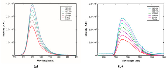 For this study, various UV irradiation intensities were used as shown in Figure 3a. Spectral presentation of the forward luminescent light for the QD250 sample is presented in Figure 3b.