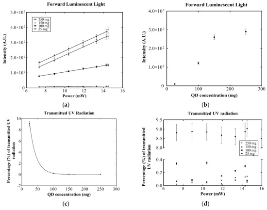 (a) The intensity variation of the forward luminescent light while increasing the power of the incident UV radiation; (b) the intensity variation of the forward luminescent light while changing the QD concentrations; (c) the percentage of the incident UV radiation that passed through the compound films for the four QD concentrations; and (d) the percentage of the UV radiation that passed through the compound films by increasing the power of the incident UV radiation.