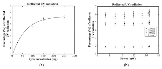 As seen in Figure 6a, the intensity of the reflected UV radiation ranges from about 2% to approximately 6% of the incident UV radiation, as the quantum dot concentration ranges from 25 to 250 mg. Values for Figure 6a were obtained using 11.9 mW incident UV radiation power. The intensity of the reflected UV radiation increased up to the concentration of QD150 while after that point it remained virtually unchanged, indicating that the concentration of the QDs affects the composition of the reflective surface and, thus, the optical properties of the compound films, such as refractive index, back scattering, etc. [46,47]. Reflected UV radiation remains almost unaffected by the increase of the power of the incident UV radiation, Figure 6b.